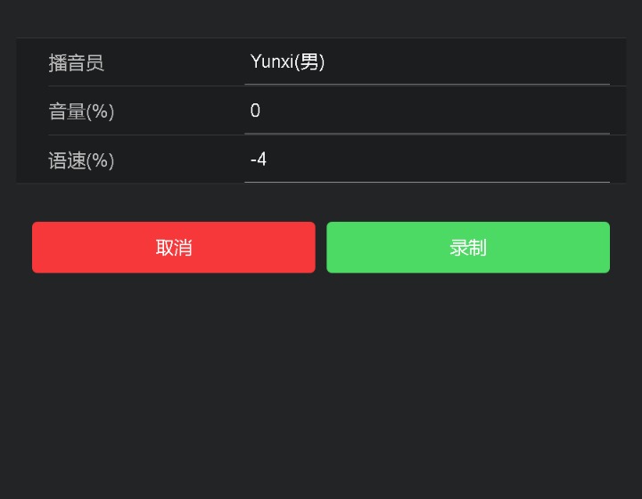 选择播音员(可选男女普通话、东北话、粤语等多种)、音量、语速,点击‘录制’。等待录制结束。