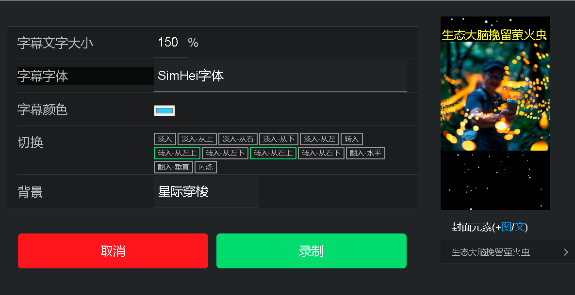 设置字幕文字大小、字体、颜色以及图片切换动画(可多选依次采用),根据内容设置一个吸引眼球的短标题,大字放置到封面